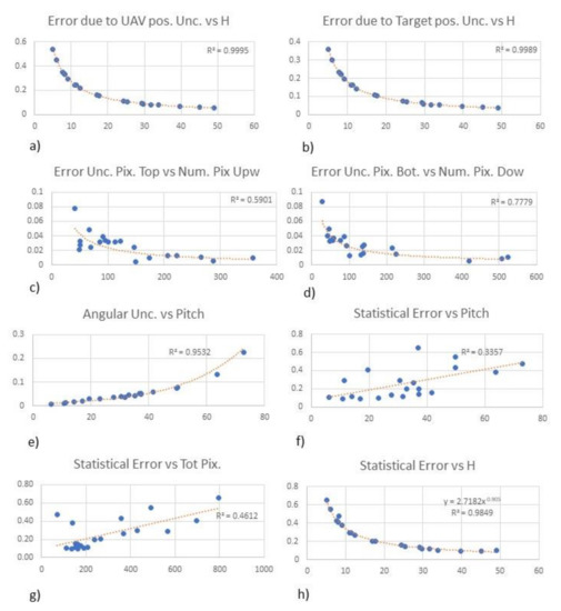 (a) Error in the estimation of height (obtained as: real target height—height estimation considering uav positional uncertainty) plotted against H (see Table 1). (b) Error in the estimation of height (obtained as: real target height—height estimation considering target positional uncertainty) plotted against H (see Table 1). (c) Error in the estimation of height (obtained as: real target height—height estimation considering uncertainty number of pixels toward top) plotted against pixels upwards (see Table 1). (d) Error in the estimation of height (obtained as: real target height—height estimation considering uncertainty number of pixels toward the bottom) plotted against Pixels downwards (see Table 1). (e) Angular uncertainty plotted against the pitch angle (see Table 1). (f) Combined statistical error plotted against pitch (see Table 1). (g) Combined statistical error plotted against the total pixels (pixels downwards + pixels upwards, see Table 1). (h) Combined statistical error plotted against H (see Table 1).