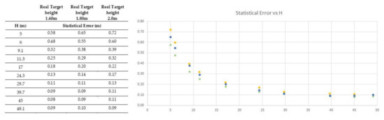 Regarding the first point (a), let us consider Figure 10 where the statistical error has been calculated for ten different H considering a height of target = 1.60 m, 1.80 m and 2.0 m. A different height of the target is clearly generating a different distribution of the error but is always well-aligned along a negative power function. Moreover, the distribution flattens when the horizontal distance is above 15 m.