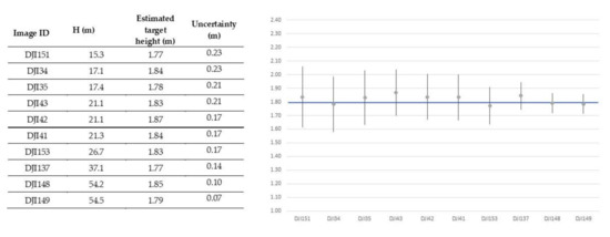 This field test has similar conditions as those discussed in Section 2.6: the UAV positioning has an uncertainty of ±1.5 m, the uncertainty associated with the position of the target is ±1.0 m, the uncertainty related to the number of pixels spanning the feature is ±3 pixels at the top and ±3 pixels at the bottom and uncertainty related to pitch is ±1°. Therefore, the equation identified in Figure 9e (y = 2.7182x−0.905) can be used to calculate the uncertainty using H. However, as already discussed, only for values above 15 m this can be cautiously used. Figure 12 reports the 10 images extracted from Table 3 and Table 4 with H above 15 m and, for each of them, the uncertainty is displayed. These values are also reported graphically in the same figure. The real height of the target (1.80 m) is included in the range of each image.