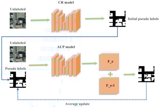 After continuous iterative updates, we gradually acquire more accurate pseudo labels. We add them to the training set and train them to obtain a better model. The whole process of our semi-supervised remote sensing image semantic segmentation method based on CR and AUP is shown in Algorithm 1.