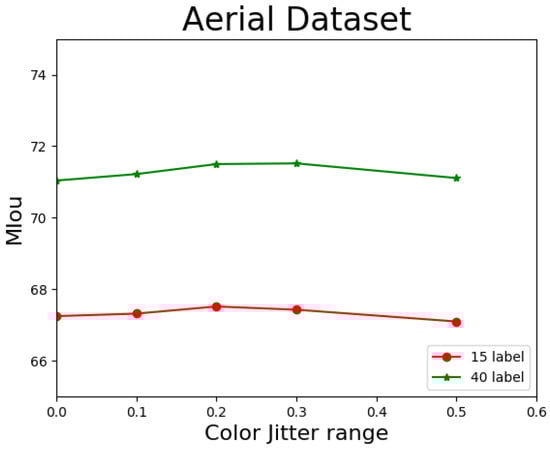 In our experiments, ADAM was used as training optimizer for all methods and the initial learning rate was set to 0.0001. For unsupervised image perturbations, we first randomly flipped the input image. Then, we added Gaussian noise to the original image, and we selected some images from ISAID dataset for comparison. As shown in Figure 3, when the coefficient is too large, the object in the image is too greatly affected, which is not conductive to model training. Thus, we chose a noise factor of 20 in our experiments. Finally, we conducted random color jitter for remote sensing images, and the coefficient range of dithering was usually 0.1–0.5. We conducted several groups of comparison experiments with different labels on INRIA Aerial Dataset when we used UNet. As shown in Figure 4, the model performs better when color perturbations are added. However, when the perturbation is too strong, the mIoU of the model decreases. Therefore, we finally conducted random color jitter within the 0.2 range of brightness, contrast, and hue, rather than using image translation.