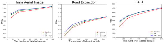 After a large number of experiments, we can conclude that our method CR and AUP is effective for semi-supervised segmentation of remote sensing images. As can be seen from the above experiments, when 1/8, 1/4, and 1/2 of the labeled data are used, respectively, our results are significantly improved compared with the baseline models. Therefore, we further explored the differences in the degree of improvement of our methods for different proportions of labeled data in the training data. We selected the best baseline model DeepLabV3+ and compared its results across different datasets. The segmentation performance of the model corresponding to variation of number of labeled images is shown in Figure 7.
