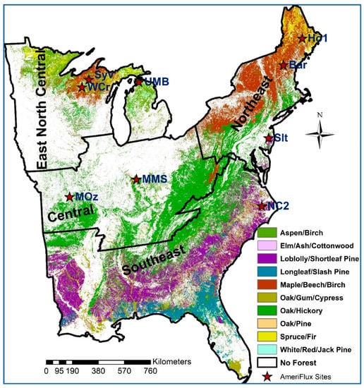 The study area was divided into Central, East North-Central, Northeastern, and Southeastern forest/climate regions [] (Figure 1). The Oak/Hickory (38%), Loblolly/Shortleaf Pine (17%), and Maple/Beech/Birch (15%) forest type groups dominate the study area. However, each forest/climatic region has its own characteristic and areal extent of forest group types as well as species composition. For example, the highest percent area coverage of the Northeast Climate Region is the Maple/Beech/Birch Group (about 66%), followed by the Oak/Hickory Group (about 22%). In contrast, the highest percent cover of the forest group in the Southeast Climate Region is the Oak/Hickory Group (about 40%), followed by Loblolly/Shortleaf Pine Group (about 28%). Detailed information and the data for the U.S. is available at USDA’s Forest Service website at [].