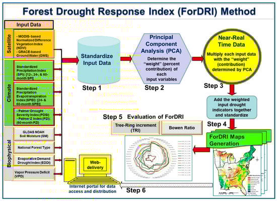 In this study, we present the Forest Drought Response Index (ForDRI), a new ‘hybrid’ drought tool developed to monitor and assess forest drought conditions through the integration of satellite-based observations of vegetation conditions, evapotranspiration (ET) estimates from satellite, root-zone soil moisture (satellite-estimated or modeled), climate-based drought indices, and biophysical characteristics of the environment. These input variables are combined based on their contribution (weight) determined by covariance (principal component analysis) to provide the ForDRI value at each grid point. The overarching goal of ForDRI research is to develop an integrated forest drought monitoring tool for decision makers using satellite, climate, and biophysical parameters to address the need and challenges of forest drought monitoring on the order of weeks to months and years.
