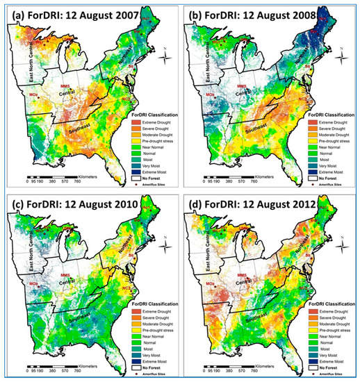 Example of the Forest Drought Response Index (ForDRI), showing maps of eastern U.S. Forest Service regions for week 32 (August 12) for selected years: (a) 2007, (b) 2008, (c) 2010, and (d) 2012.