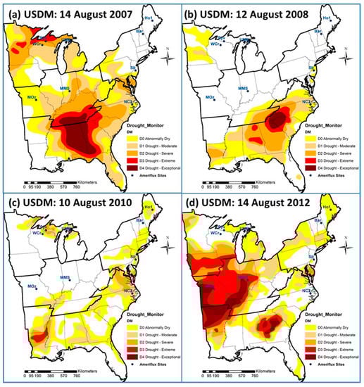 The U.S. Drought Monitor (USDM) maps for mid-August: (a) 2007, (b) 2008, (c) 2010, and (d) 2012 for qualitative comparisons.