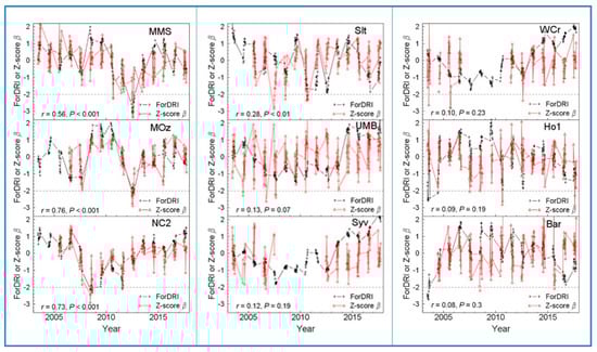 Comparison of the historical records of ForDRI values and normalized Bowen Ratio (Z-Score βι) at nine AmeriFlux sites that include Bartlett Experimental Forest (Bar), Howland Forest (Ho1), Morgan Monroe State Forest (MMS), Missouri Ozark Site (MOz), North Carolina pine forest (NC2), Silas Little Forest (Slt), Sylvania Wilderness Area (Syv), Univ. of Mich. Biological Station (UMB), and Willow Creek (WCr).