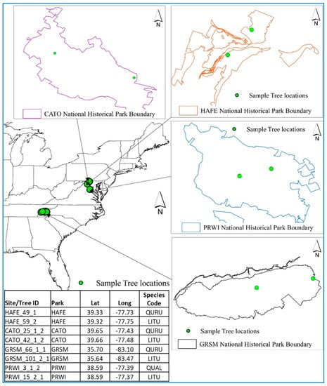 Tree ring increment (TRI) data from eight sites were used to assess ForDRI values at the four national parks (i.e., HAFE, PRWI, GRSM, and CATO). The tree ring increment is the width of a tree ring that shows the amount of growth taken place over one year and thus indicates the growing conditions for that year. The data that we used include 38 trees in CATO park (two per each site), 115 trees in GRSM (two per each site except one site with only one tree), 24 trees in HAFE (two per each site), and 44 trees in PRWI (two trees per each site). To analyze the correlation of the ForDRI and TRI, two sites from each national park were selected (Figure 6). Three species including American tulip tree (Liriodendron tulipifera), northern red oak (Quercus rubra), and white oak (Quercus alba) were selected for tree ring increment data analysis. Niinemets and Valladares [] considered Liriodendron tulipifera and Quercus rubra moderately susceptible to drought and Quercus alba moderately tolerant []. At each of the selected park sites, the individual tree ID and species type are shown in Figure 6.