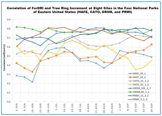 Figure 7 shows the correlation between annual tree-ring increment data and ForDRI weekly values during the summer season (June to September). The ForDRI values at a weekly interval were compared with the tree ring annual data at each site between 2003 and 2017 to identify the best period to monitor drought stress on trees using the ForDRI model. The results showed that four sites at GRSM and PRWI have higher correlations (between 0.61 and 0.82) with ForDRI during all weeks of summer (Figure 7) than the other park sites. The correlation peaked when compared with ForDRI values from mid-August. Tree ring increment at the two CATO sites also showed relatively good correlation (0.35 < r < 0.73) with ForDRI. At this site, the highest correlation (0.73) was found in July. Tree ring increments recorded at two HAFE sites showed relatively lower correlations (0.22 < r < 0.63) with ForDRI. This could be because the dominant tree species in the park (oak) are drought-tolerant. In addition, differences in the strength of these relationships may depend upon tree site specifics (ridgetop vs. valley), soils, or other factors. In addition, the frequency and intensity of drought at these four national historic parks over this relatively short interval were not identical. Generally, however, the comparison revealed that the ForDRI values showed reasonable correlation with the tree ring increment, so ForDRI maps may help decision-makers monitor tree drought stress in these parks.