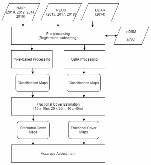 Methods for this study include image pre-processing, image segmentation, image classification, grid-based fractional cover estimation and accuracy assessment (Figure 2). Software utilized for image processing and analysis includes ERDAS IMAGINE, eCognition, and ArcMap.
