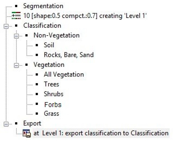 The process flow outlining the segmentation and classification scheme and rulesets is illustrated in Figure 3. Segmented objects were first classified based on the growth form (shrub, forb, grass, tree or other non-vegetation cover). Higher-spatial-resolution image datasets were further classified to distinguish shrub species for objects classified as shrub growth form type. After the classification process, the resultant maps were exported to ERDAS IMAGINE Image (.img) file format.