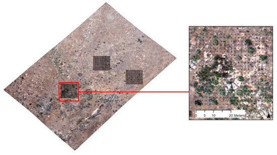 Field sampling took place in September of 2019. Of the seven field sampling grids, three were located in AOI 1 and two within AOI 2 and in AOI 3. Figure 4 provides an example of the sample plot distribution and sampling grid for AOI 1. The field sampling grids are 40 × 40 m containing grid points with x and y spacing of 2 m. In the field, an interpreter navigated to the corners of each plot using Global Positioning System (GPS) data. A meter tape was used to locate grid point locations at 2 m intervals. At each point, a biologist determined the growth form type (shrub, herb or bare). If a shrub was present, the shrub species was identified. For the 10 × 10 m grid, 25 points per grid cell (5 × 5 points) were used in the calculation of shrub cover. For the 20 × 20 m grid, 100 points per grid cell (10 × 10 points) used. This was done to avoid having the overlapping points used for the calculation of two neighboring cells. The very top row and right column of points were not used in the calculations. For the 40 × 40 m cover calculation, all the points were used. This led to small differences in the estimates when averaging the smaller grids up to the larger 40 m grid.