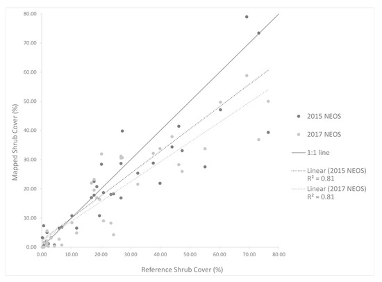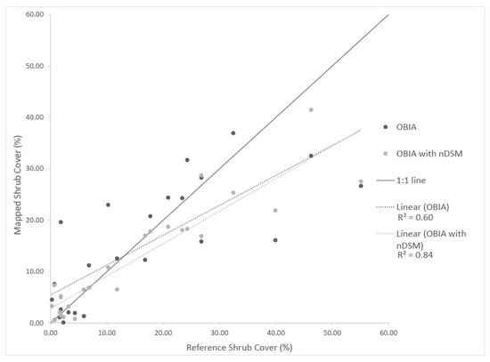 Combining the accuracy results for both AOIs 1 and 2, we see that the incorporation of the 2015 NEOS multispectral and nDSM data as input to OBIA yields the lowest error estimates for the shrub fractional cover maps. Using only NEOS multispectral image inputs, a regression of the mapped shrub cover on the reference shrub cover yields an R-square value of 0.60. With the nDSM data included, the R-square value is higher at 0.84 (Figure 9). In both cases, the image classification products tended to underestimate shrub cover relative to the reference data, as indicated by a best fit line that is shallower than the 1:1 line.