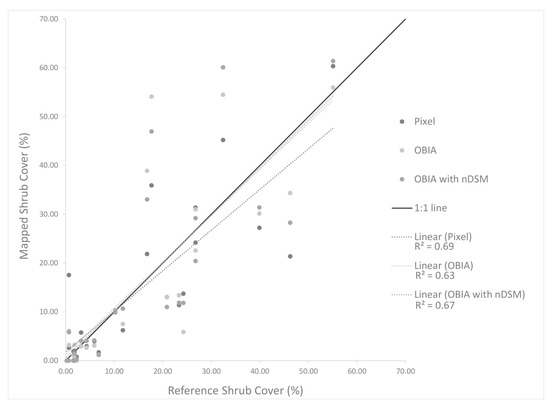 Inclusion of the nDSM in the OBIA classifier did not result in the same higher level of accuracy for the 2016 NAIP products, as for classifications using the higher spatial resolution images for 2015 and 2017. Moreover, the pixel-based method applied to the 2016 NAIP imagery yielded a shrub cover map with lower error than both OBIA methods. For the 2016 NAIP imagery, the pixel-based method yielded the highest R-squared value of 0.69, while the OBIA method yielded products with greater estimation errors with an R-squared of 0.63. The addition of the nDSM resulted in a higher accuracy for the OBIA method, yielding an R-squared value of 0.67 (Figure 10). While the scatter is substantial, the OBIA with nDSM line is close to the 1:1 line, with a slight underestimation of the cover for the image classification-based estimates.