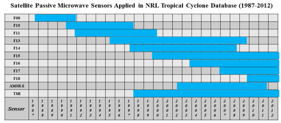 Chart of all satellite passive microwave (PMW) sensors during 1987–2012 used in the Naval Research Laboratory (NRL) Tropical Cyclone (TC) database.