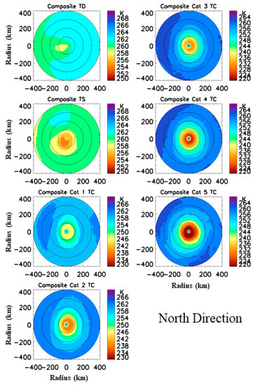 Composition of a large sample of observed TCs from PMW sensors is the best way to present an accurate climatology of TC structure. Figure 4 displays distributions of the composite TBs at 89H GHz relative to the North direction for each storm intensity category during 1987–2012. The prominent feature for Cat 1–5 TCs is the consistent concentric pattern of TBs, which is easily understandable because of the TC consistent eyewall and spiral convections. A decrease of TB amplitudes near eyewall associated with increase of TC intensity is evident. The concentric pattern is not clear for TS and TD.
