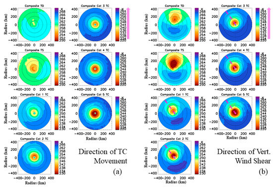Same Figure 4, except for composition with regard to (a) direction of TC movement and (b) direction of the 200–850 hPa wind shear. The pink vertical arrow shows direction of the TC movement or 200–850 hPa wind shear. The red dashed line in (b) is for axis of the minimum TBs.