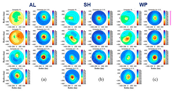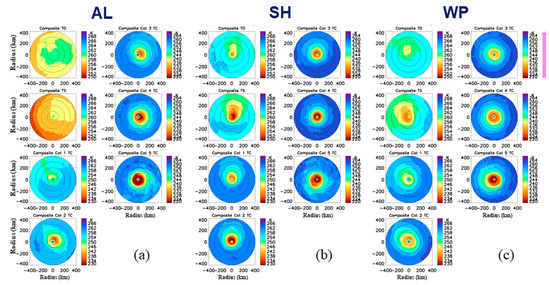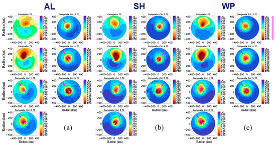 Distribution patterns relative to the North direction at each storm intensity category over AL, SH and WP are displayed in Figure 10. These kinds of patterns actually reflect the combined impacts of the storm motion and the 200–850 hPa wind shear on storm structures. The similar concentric pattern for Cat 4–5 TCs among these basins are expected because a strong vortex and consistent eyewall appearance associated with intense TCs that are more resilient to the external forcing than the weak storms. The relative minimum TBs at 89H GHz within radius of 300 km are in the northeast quadrant for AL Cat 1–4 TCs, where relatively low TBs are also evident for Cat 5 TCs (Figure 10a). The approximate eastward direction of the vertical wind shear vector indicates that location of the TC minimum TBs is corresponding to DSLQ. Due to the mostly northwest direction of the TC motion, the motion impact is actually in a competitive role of the vertical wind shear. However, results demonstrate the vertical wind shear has a dominant role on the AL TC structure.