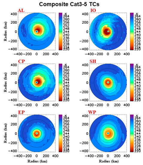 Regional differences of TC structure are visible from comparison of 89H GHz TB distributions among the six basins. Figure 11 shows distribution of TBs at 89H GHz for the composite Cat 3–5 TCs over the six basins regarding the North direction. Although the strong TC vortex is resilient to the environmental impacts, a geographic variation is obvious. The concentric patterns of TBs within a 200 km radius are clearly shown in EP, SH, and WP. Both AL and CP basin has the minimum TBs concentrated in the northeast quadrant, while in the west quadrants over the IO basin.