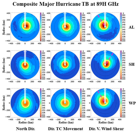 Comparison of the composite TB distributions at 89H GHz for major hurricanes over AL, SH and WP. Left, middle and right panel is for composition with regard to northward, direction of TC movement, and direction of the 200–850 hPa wind shear, respectively. White arrow is direction of the composition method for each panel. The red dashed line in the right panel is for axis of the minimum TBs.