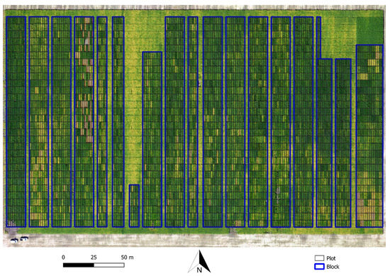 Example of soybean breeding field trial (T4) with layout of plots overlaid on top of the UAV mosaic from images acquired 112 days after seeding.