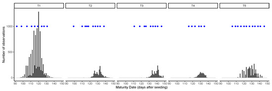 Distribution of ground truth maturity dates and image acquisition dates (blue dots) in each trial.