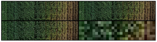 Another important aspect of the images that may affect the model is resolution. Images with downsampled resolution simulating a GSD of 50, 100, and 750 mm/pixel were used to train and compare models. The images were resized accordingly and then compressed to JPEG. For training the model, after decompressing the images, they were scaled back the original resolution in order to use the same model architecture, as illustrated in Figure 3. The visual difference between images with a GSD of 25 and 50 mm/px is very subtle. With 100 mm/px, the difference becomes more evident. The images at 750 mm/px lose all texture information. These were used to help understand the importance of color versus texture and other high-level features.