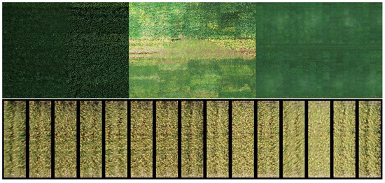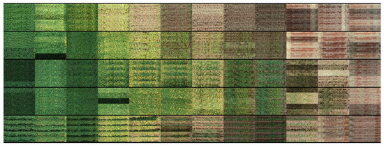 One of the disadvantages of using low-cost RGB sensors is their sensitivity to variation in light conditions, as observed in Figure 4. This motivated the comparison of different data augmentation strategies to improve the model’s robustness. The first type of image augmentation consisted of digital transformations of the images by applying variation in contrast and luminosity. On the other hand, the availability of many replicates from each plot may be seen as more natural data augmentation. The availability of many replicates can reproduce geometric errors, distortions, blur, and shadow effects that are hard to reproduce with synthetic data augmentation. Therefore, three different strategies of augmentation were compared: no augmentation, synthetic data augmentation, and using the image replicates. At this time, the image digital numbers stored as 8bit integers were converted to 32 bit floats and scaled from the original range (0–255) to have zero mean and unit variance.