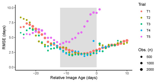 In four of the five trials, the lowest RMSE was observed when the images were acquired about one week before maturity, while for T5 the lowest error was obtained when the images were taken about two weeks prior to maturity (Figure 7). Looking at the images of T5, it was noted that in many plots the plants were lodged on the neighboring plots. Furthermore, it was noted that weed growth occurred simultaneously with the crop senescence, and most importantly, leaf retention after pod senescence. These factors contributed to larger errors when the used images are taken closer to senescence. So, even though under optimal experimental conditions images close to maturity would be preferred, the confounding factors could affect the predicted values and increase the error. When considering all data, the errors remain relatively low for about 12 days before maturity; outside of this range, the errors increase substantially. Based on these observations, the value of the GTDiff was set to −6, meaning that from all the available image dates, the one that predicted maturity would occur about 6 days after the acquisition was used as the center image. The two images acquired immediately before and after this center image usually fell within this 12 day time window. The choice of five images was based mostly on the minimum number of images usually available for the trials. Choosing a fewer number of images may degrade the performance; this is because at prediction time the GTM value is unknown, and the estimates from individual images are used to find the center image. The use of more images confers robustness to the model, in case the choice of images was not optimal.