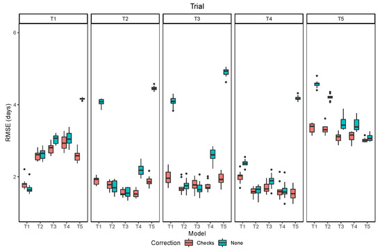 The overall performance of the models trained and evaluated within the same trial indicated an RMSE inferior to 2 days in all trials except T5, in which the RMSE was about 3 days (Figure 8). The lower performance in the last trial is attributed to the lower quality of image acquisition, with more shadows, and to the higher frequency of lines with leaf retention. The performance of models trained in other trials and seasons varied among trials. For most cases with high RMSE there was a bias of a few days in the distributions of predicted and observed values. This could be due to some offset in the relationship of leaf senescence and pod senescence caused by environmental factors and their interaction with the genotype. Part of this bias may also be due to differences in the GTM data acquisition, since the maturity date is an estimate subject to human error. The bias in the raw predictions was corrected using the information from the reference check plots, which greatly reduced the extremely high values of RMSE.