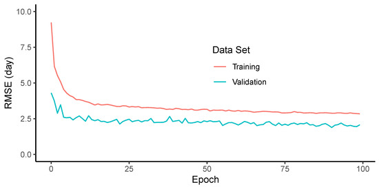 When evaluating the RMSE of the adjusted maturity dates, the models showed good generalization (Figure 9). It can be noted that the number of model parameters and dropout were effective at avoiding overfitting, since the validation loss did not show any trend to increase within the number of epochs used. The RMSE values were lower when the conditions were similar, but the increased errors when the conditions of the trial changed. For example, all models performed well in trials T2, T3 and T4, which had good quality images and no confounding factors in the trial. However, all the models that were trained in other trials, had higher errors in T1. One reason for that was due to the emergence of a new generation of seedlings after the harvest of the earlier maturing lines. This caused some plots to be green again in the last two acquisition dates. Even though this effect added a low error, considering that the predictions in the single date model were good enough to choose the early images, under other conditions, few large errors could cause an overall increase in the RMSE.