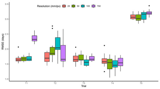 The effect of resolution was small, resulting in similar model performance in most trials with variations between 25 and 100 mm/px (Figure 10). The most significant increase in the RMSE was observed in T1 with the lowest resolution (750 mm/px). This shows that the features learned by the model in T1 depend on the texture of images and not only on the color. For the other trials, the small differences may be related to the number of observations used to train the model, which were five to 10 times fewer than what was available for T1. The trials in which the quality of resolution was less important also had more problems with out of focus images such as the examples shown earlier (Figure 4). It is also important to note that even with the best resolution (25 mm/px), the pods cannot be distinguished from the leaves, which would be necessary to improve the models when germplasm expressing leaf retention is present in the trials.