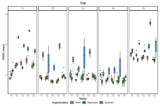 Prediction performance measured by the root mean squared error (RMSE) as related to different data augmentation strategies.