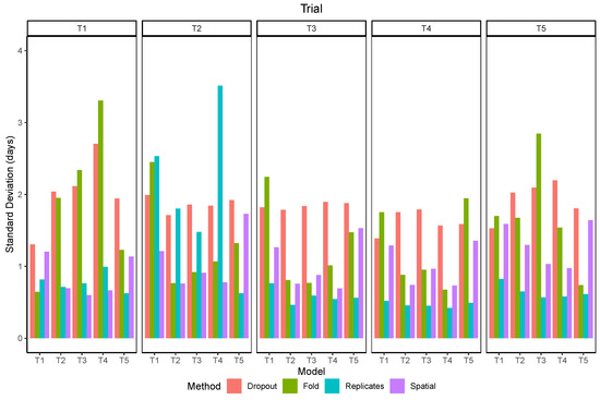 The standard deviation of the within-plot predictions (spatial) was more related to the data used for training than the trial in which the predictions were made (Figure 12). The values were lower than 1 day for models trained in trials with bigger plots and higher than 1 day for the models trained in T1 and T5. The standard deviation of using models trained with different subsets of the data (folds) shows a clear difference towards lower RMSE when the model included data from the same trial and when it did not. There was also a distinction of two groups of trials, as models trained in T2, T3, or T4 had lower variation when tested within this group but higher values when tested in T1 or T5, and vice-versa. The standard deviation of using image replicates was lower than 1 day for all trials except in T2, for which its values were higher than the uncertainty estimated by other methods. The standard deviation of predictions with dropout layers enabled was usually higher than the other methods, but similar for all trials and models.