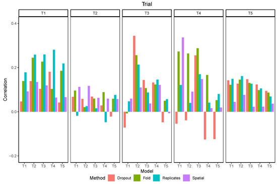 The correlations between the standard deviation of predictions and the absolute error varied from −0.1 to 0.3 depending on the trial and the model (Figure 13). In most scenarios the correlation was positive, although some negative values were observed, mostly when using dropout. The overall correlation was higher in T1 and lower in T2, independently of the method. Using dropout presented mixed results, with the best correlation when the model trained in T2 was used in T3. Using the replicates produced the best results in T1 and T5.