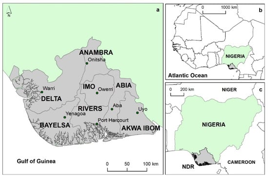 (a) Our delineation of the Niger Delta Region (comprising of the states of Abia, Akwa Ibom, Anambra, Bayelsa, Delta, Imo, and Rivers), and its location within (b) West Africa and (c) Nigeria.