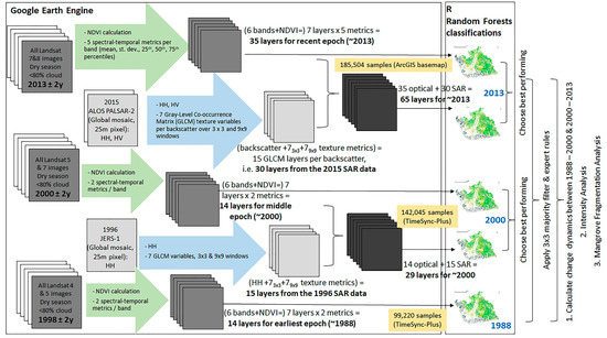 We mapped the main land cover types in three epochs centred around 1988, 2000, and 2013, and assessed land cover change and change intensity in the two respective periods. The chosen classes were: Water, urban (i.e., built-up), woodland (i.e., lowland rainforest and freshwater forest), bareland, agricultural land, grassland, mangroves, and degraded mangroves. The choice of the classes was based on our knowledge of the area, the nomenclature used by ESA’s 20 m land cover data for Africa and the 30 m-pixel Landsat-based GlobeCover30, and our desire to separate healthy mangroves from degraded ones. By definition, degraded is the land that has temporarily or permanently undergone a lowering of its capacity to deliver ecosystem services [65]. In the case of mangroves, the degraded forest has less biomass and tree cover, and is unable to provide a number of services at the same level as the healthy system, e.g., support for local livelihoods, carbon sequestration, erosion protection, provision of habitat for numerous fauna species, amongst others [66]. We also assessed the fragmentation of the mangrove forest during these two periods. Additionally, we tested the performance of the classifier when radar data are added to the optical. Figure 2 is a flowchart of our methodological framework.