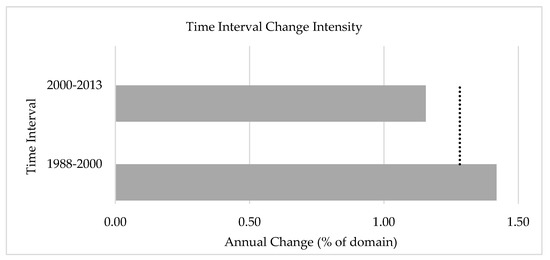 The interval level of the intensity analysis identifies the time interval in which the overall annual rate of change is faster. The total change in both intervals was found to be relatively similar: ~17% of the total area in the first period and ~15% in the second. However, the intensity of the annual area of change in the first interval is faster than in the second (1.42% and 1.16%, respectively; Figure 5). The output of Equation (2) is 1.28%, depicted as a dashed line in Figure 5. Compared to this value, the rate in the first period is considered ‘fast’, while in the second ‘slow’.