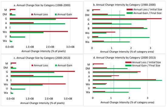Figure 6 is the graphical representation of the ‘category level’ of the intensity analysis. Figure 6a,c depict the size of the annual gain of loss of each land cover class in the first and the second period, respectively. Figure 6b,d show the intensity for a class’ annual gain or loss, as calculated by Equations (3) and (4). The two dashed lines show the output of Equation (1) for each period, i.e., the uniform line for each period at this category intensity level [52]. When an intensity bar remains to the left of the uniform (dashed) line, then the change is relatively dormant for that land cover class and period. On the contrary, if the bar extends to the right of the dashed line, then the change is relatively active for that class and period. If, for a given land cover class, the intensity of the gains or losses remain active or dormant during all study periods, then the specific type is considered stationary.