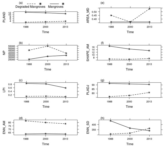 Figure 7 depicts the evolution of the selected landscape metrics through time for the healthy and the degraded mangroves classes.