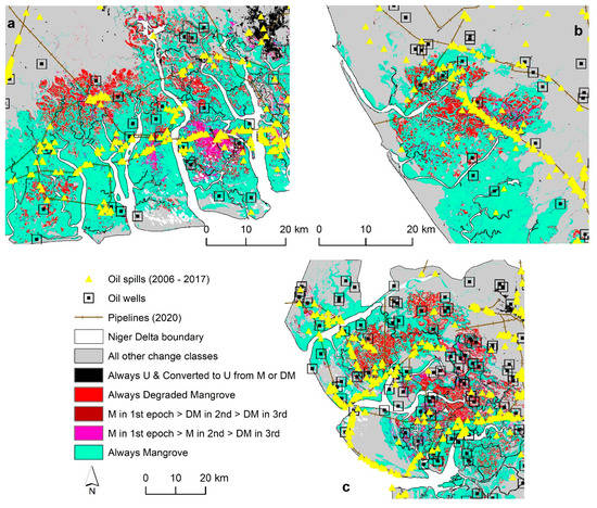 A visual examination of the land cover maps and derived change maps from these revealed three areas that demonstrate higher concentrations of degraded mangrove. One such area is in the eastern part of the NDR, around the city of Port-Harcourt and the towns of Bonny, Okrika, and Degema (Figure 8a). Mangrove degradation here can be attributed to the effects of rapid urbanisation and oil extractive activities [14,17], as demonstrated by the overlap with the locations of the oil wells, the pipelines, and the oil spills in Figure 8a. At the central part of the study area, mangrove degradation is mainly due to oil spills resulting from crude oil extractive activities, notably near River Bayelsa and the towns of Nembe, Southern Ijaw, Ekeremor, Brass, and Oloibiri, where oil extraction first began as early as the 1950s (Figure 8b). The highest concentration of degraded mangroves is, however, in the western part of the NDR, in the Delta state (Figure 8c). This area shows widespread degradation, with a notable increase in the second and third date around the towns of Wari South and Wari South West. Several oil spill and gas incidents have been reported in the literature around this area and period [14,15,17,18].