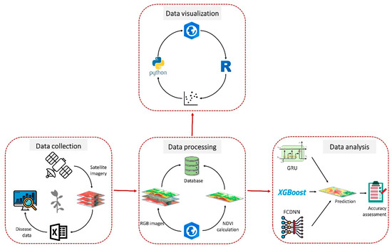 A growing interest has been observed recently in the early detection of plant diseases. Researchers have used different remote sensing tools for early detection and monitoring of plant diseases at different spatial levels, such as leaf scale [54,55,56,57,58,59], plant canopy scale [3,60], plot-scale based on aerial imagery [61,62] and field-wide-scale based on satellite imagery [29,63,64,65]. Although many studies obtained remotely sensed data at different time points, none of them incorporated time-series information in the analytical models.