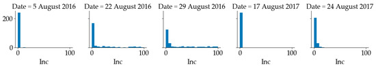The number of total plants and plants showing foliar symptoms of SDS was counted in each quadrat to calculate the disease incidence on a 0 to 100% scale, based on the percentage of diseased plants. The distribution of SDS incidence is shown in Figure 3. It can be observed that in 2016, SDS incidence in more than half of the 240 quadrats was less than 5% and the SDS incidence of the rest quadrats ranged from 5% to 100%. In 2017, the SDS incidence of most quadrats was below 5%. In this paper, if a quadrat had an SDS incidence above 5%, it was considered as diseased (positive); otherwise, it was considered as healthy (negative). The inspection dates used for the analysis were 27 July 2016, 5 August 2016, 22 August 2016 and 29 August 2016. Since the visual disease scores on 27 July 2016 were all zeros, all the imagery collected before that date was labeled as healthy. The human visual ratings recorded on 5 August 2016 were mapped to the imagery collected on the same date. The visual score on 22 August 2016 was mapped to the imagery collected on 21 August 2016, while the SDS rating recorded on 31 August 2016 was mapped to the imagery collected on 29 August 2016 Similarly, in 2017, the human visual ratings recorded on 17 August 2017 were mapped to the imagery collected on 18 Aug and the human visual ratings recorded on 24 August 2017 were mapped to the imagery collected on 23 August 2017. There was only one diseased quadrat on 5 August 2016. In 2016, all quadrats were healthy before 5 August 2016. In 2017, all quadrats were healthy before 17 August 2017. The aim was to determine whether the quadrat had SDS or not.