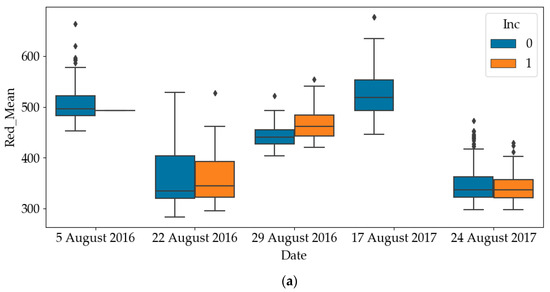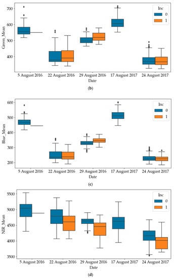 Differences in red, green, blue and near-infrared (NIR) values between healthy and diseased quadrats (Inc=0: Healthy; Inc=1: Diseased). (a) Difference in red values between healthy and diseased quadrats; (b) Difference in green values between healthy and diseased quadrats; (c) Difference in blue values between healthy and diseased quadrats; (d) Difference in NIR values between healthy and diseased quadrats.