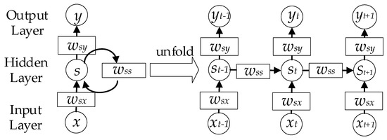 Most of the existing methods use one individual spectral measurement to predict the corresponding SDS [3]. Nevertheless, the multiple images at different times of the same quadrat may help improve the prediction accuracy of the model. Thus, a method that can handle time-series imagery is needed. Recurrent neural networks (RNNs) are suitable for non-linear time-series processing [45]. As shown in Figure 5, the RNN consists of an input layer x, a hidden layer h and an output layer y. When dealing with time-series data, the RNN can be unfolded as the right part. The output and hidden layers can be calculated according to Equation (5) and Equation (6), respectively.
