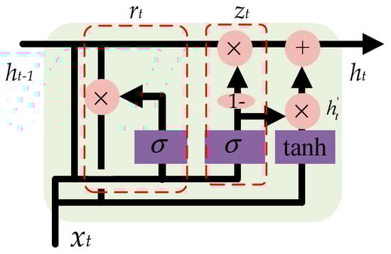In this paper, a GRU-based method is proposed to deal with the multivariate time-series imagery data that will solve the vanishing gradient problem of a standard RNN [39]. As shown in Figure 6, based on the previous output ht−1 and the current input xt, a reset gate is used to determine which part of information should be reset, as calculated in Equation (7), while an update gate is used to update the output of the GRU ht, as calculated in Equation (8). The candidate hidden layer is calculated according to Equation (9). The current output can be obtained according to Equation (10). The gates, namely, zt and rt, and parameters, namely, Wz, Wr and W, of the GRU were updated in the training process.