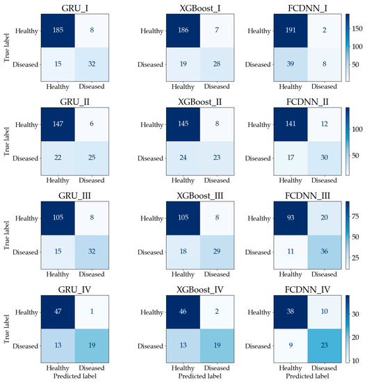 The results are shown in Table 3. In calculation I, the three methods had the same test precision. However, the test recall of GRU was 9% and 51% greater than that of XGBoost and the FCDNN, respectively. The reason why the test recall of the FCDNN is much less is that the model was overfitted and most of the samples were predicted as healthy. In calculation II, the test accuracy of GRU was 2% greater than that of XGBoost and 0.5% greater than that of the FCDNN owing to the improved test precision. It means that most of the positive predictions were accurate. In calculation III, the test accuracy of GRU was 1.8% and 5% greater than that of XGBoost and the FCDNN, respectively. In calculation IV, the test accuracy of GRU was 1.2% and 6% greater than that of XGBoost and the FCDNN, respectively. It can be observed that the training accuracy of GRU was lower in the four calculations; however, the test accuracy of GRU is the highest among the three methods in the four calculations. It proves the good generalization performance of the GRU-based method. The test precision of GRU was highest in the four calculations, which was about 80–95%. In terms of test recall, the FCDNN outperformed the other two methods in calculations II, III and IV. However, its test accuracy was lower because the proportion of positives that are correctly identified was lower.