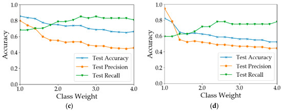 Test accuracy, precision and recall using different weights for the minority class. (a) Results of Calculation I (b) Results of Calculation II (c) Results of Calculation III (d) Results of Calculation IV
