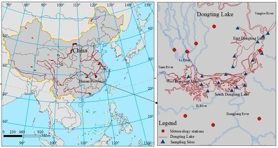Dongting Lake (111°40′E ~ 113°10′E, 28°30′N ~ 30°20′N), the second largest freshwater lake in China, has a drainage area of approximately 262,800 km2 and an average water depth of 6.39 m. The lake is located in the middle and lower reaches of the Yangtze River Basin in northeastern Hunan Province (Figure 1). The topography of the land surrounding the lake is high in the west and low in the east, and the lake can be divided into eastern, western and southern sections. Dongting Lake is adjacent to the Yangtze River to the north and four rivers (the Xiangjiang River, Zi River, Yuan River, and Li River) to the south, all of which run through Chenglingji and part of Yueyang and finally drain into the Yangtze River.