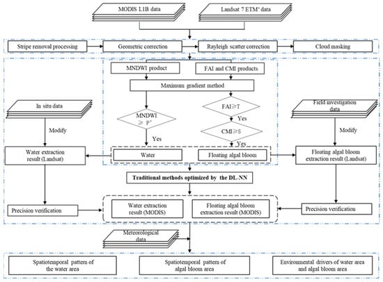 The overall methodology is illustrated in Figure 2. We performed Rayleigh correction for the MODIS and Landsat data to generate Rayleigh-corrected reflectance (Rrc); then, traditional methods were used to extract and identify the extents of the surface water and algal blooms. More specifically, time series of the FAI, cyanobacteria and macrophyte index (CMI), and MNDWI products were generated, and the maximum gradient method was used to obtain the threshold employed to extract and identify them. Second, we used the DL-NN to optimize the traditional methods to extract and identify the water surface and algal bloom areas more concisely and accurately. After verifying the extraction accuracy, we analyzed the dynamic changes in the water area and algal blooms throughout Dongting Lake. More details are given in the following sections.